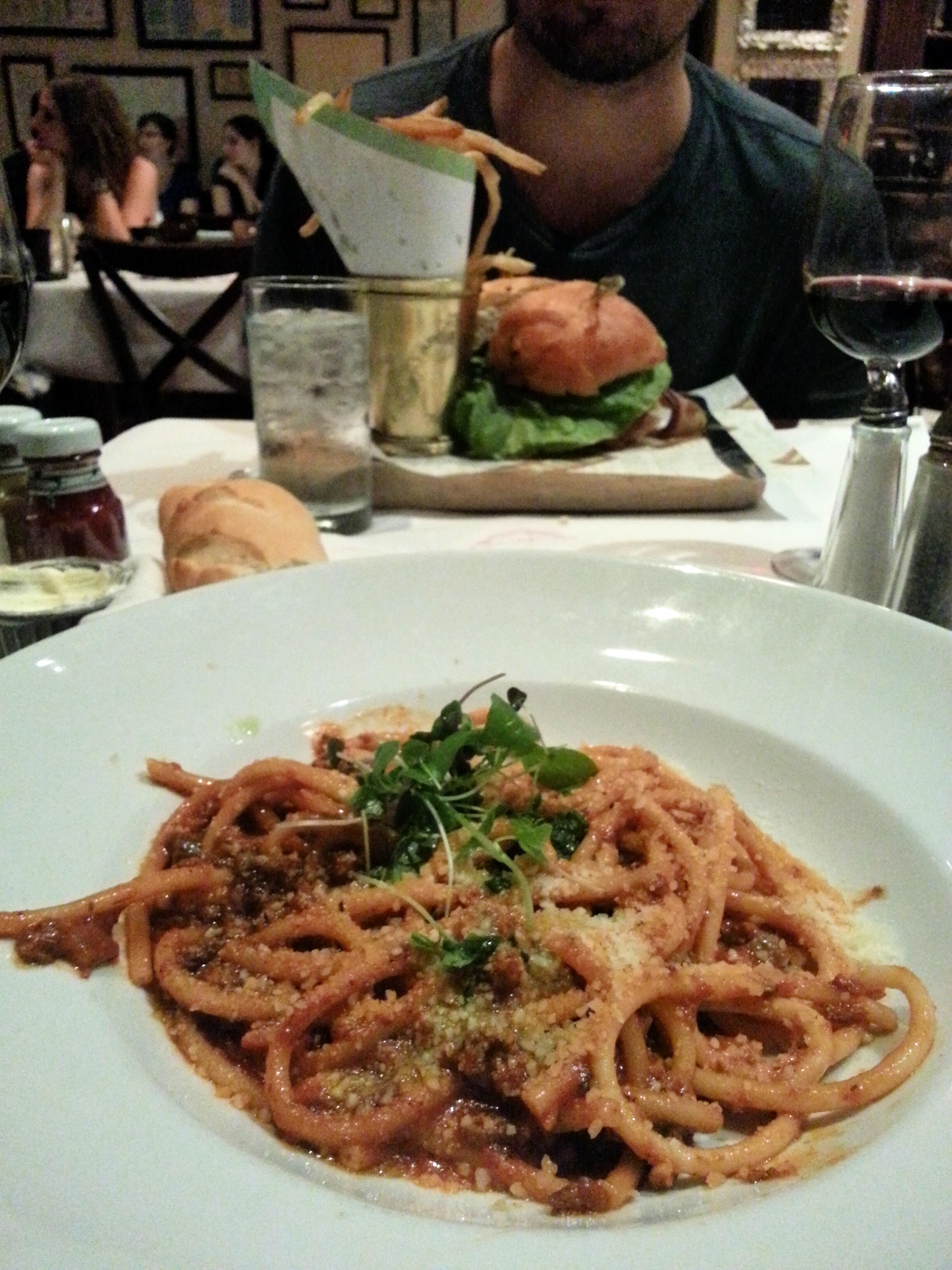 For Evan, Lüke Burger, Allan Benton’s bacon, caramelized onions, tomatoes, Emmenthaler cheese with house-made fries, and for me, Ragout of Two Run Farms Lamb, house-made bucatini, Espelette, and mint…